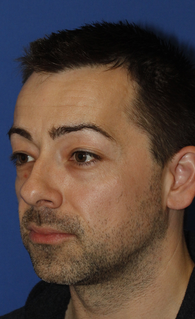 This Seattle chin implant and rhinoplasty patient was interested in smoothing his bridge bump and reducing the bulbosity of his nasal tip while making his nose smaller overall. Additionally, he wanted to create a stronger jawline and improve his recessed chin. Using an open septorhinoplasty approach Dr. Lamperti straightened the patient's crooked septum (including the caudal strut which was creating a crooked tip). He also smoothed down the patient's bridge hump while maintaining a strong bridge. Bilateral spreader grafts were placed to support the middle third of the patient's bridge following the hump reduction and to address the pre-existing pinching in this area. To refine the patient's rounded, boxy tip Dr. Lamperti performed a cephalic trim and dome binding suturing. He also reduced the interdomal distance between the nasal tip cartilages using an interdonal suture. The patient also had wide nostrils so Dr. Lamperti performed an alar base reduction using a wedge excision technique. In the preliminary 6 month after photos you can see how the patient now has a more smooth bridge and refined tip (still with some expected skin swelling present at this stage) along with a narrower nostril width and improved tip boxiness. You can also see how the spreader grafts have created a more seamless brow tip aesthetic line with no more middle third narrowing. You can learn more about this patient's chin implant surgery here.