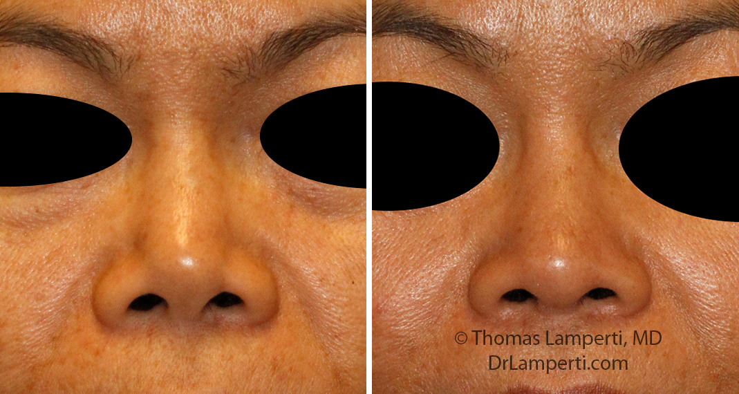 Overlying narrow tip defining points can be made wider with a soft tissue spacer graft that is placed between the domes. The patient below had naturally narrow tip that Dr. Lamperti treated during her rhinoplasty.